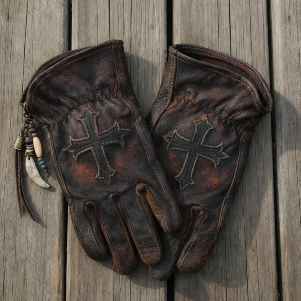 Dark style Gothic Vibe Dark Distressed Leather Embroidered Cross Gloves