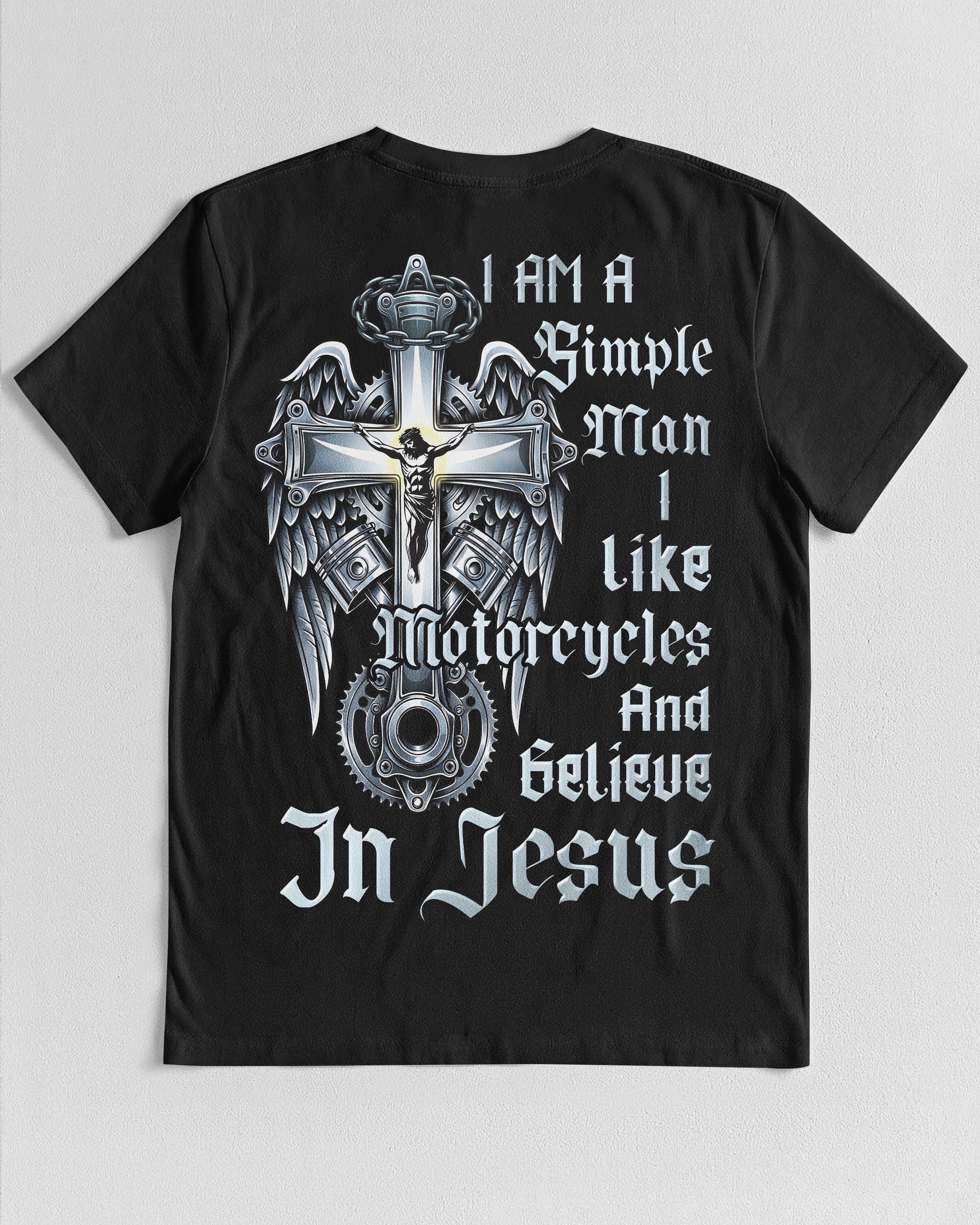 This striking T-shirt features a powerful design of a cross with wings and a chain, perfectly paired with the words, "I am a Simple Man I like Motorcycles and Believe in Jesus."