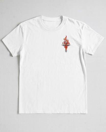 Embrace the journey of faith with this striking graphic that features a symbol of resilience and surrender. The combination of flames and tools represents the fiery challenges of life that Jesus helps us navigate.