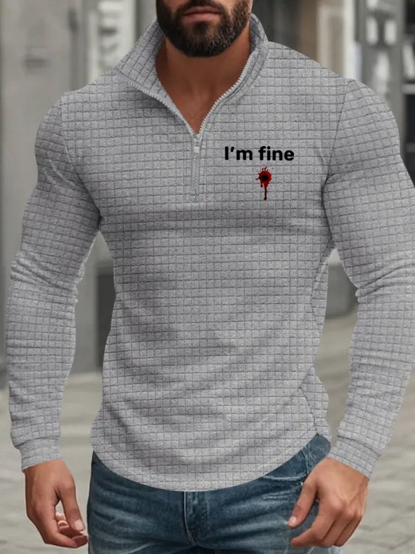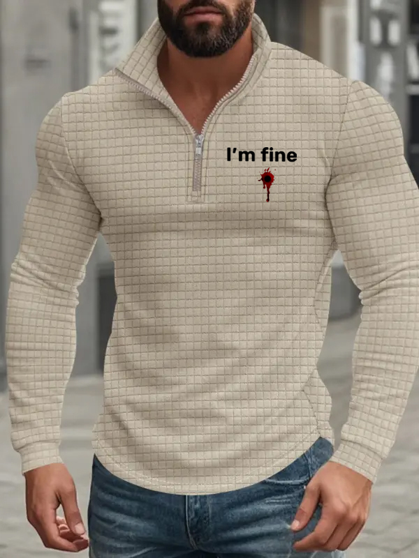 Men's American Retro Autumn And Winter Half-Zip Small Plaid I'm Fine Pattern Casual Stand-Up Collar Long-Sleeved Sweatshirt