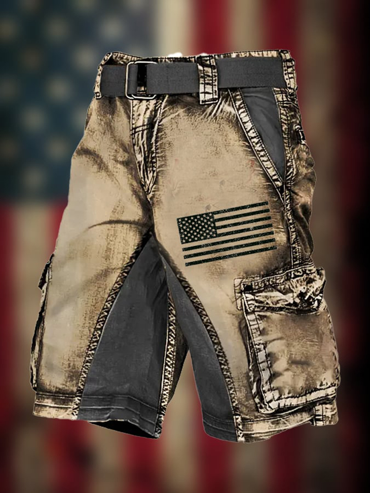 Men's Retro Flag Independence Day Contrast Multi-Pocket Print Cargo Shorts